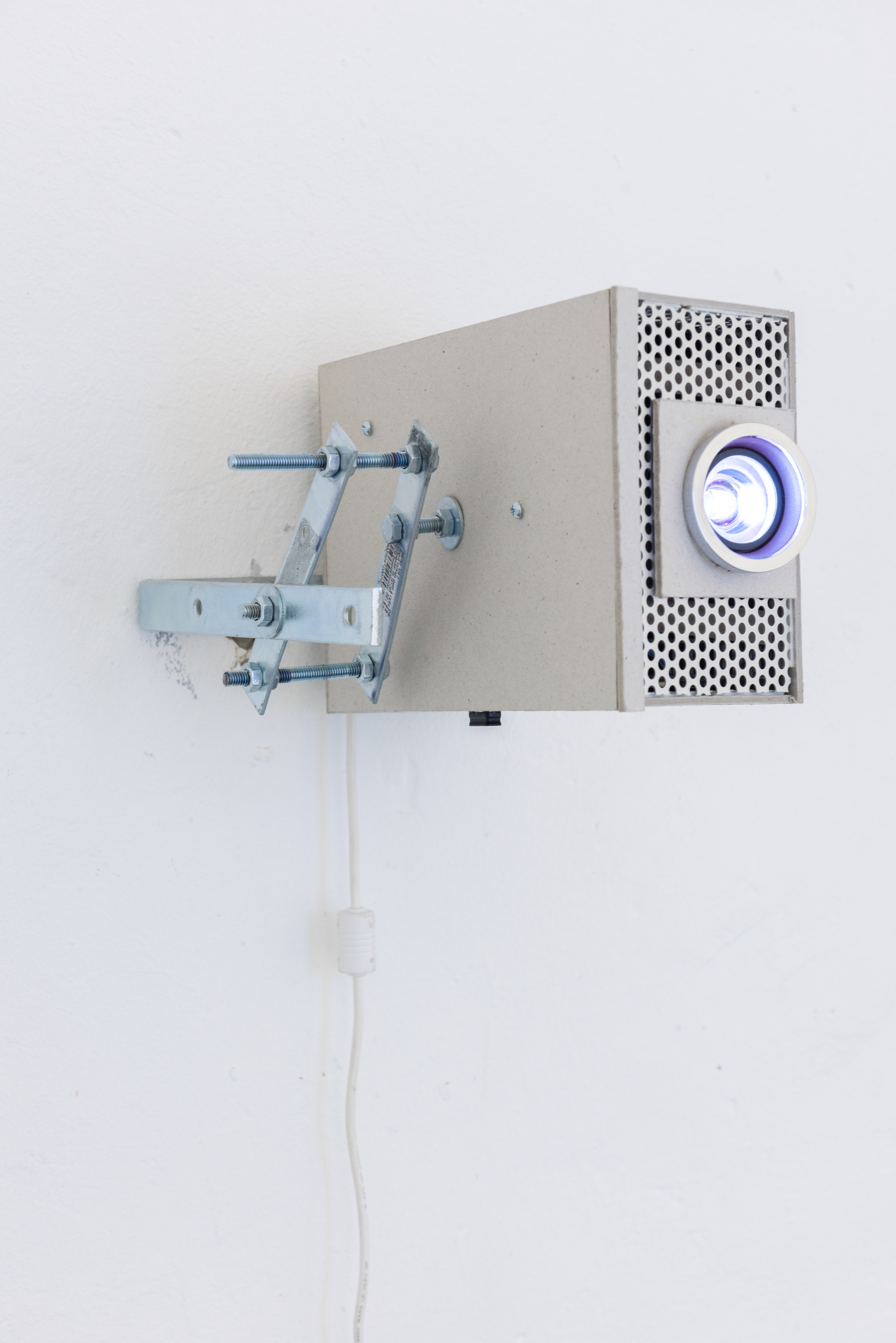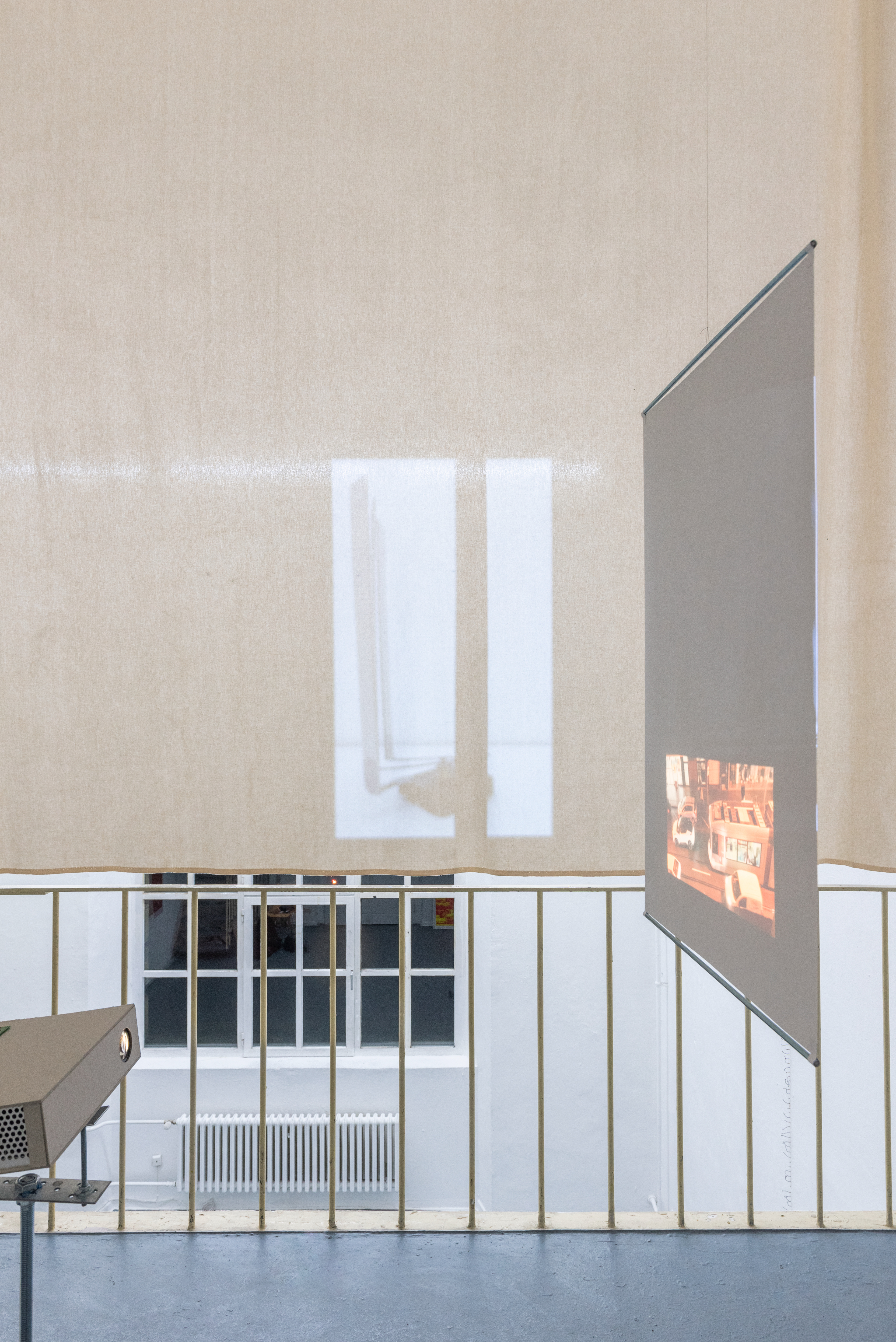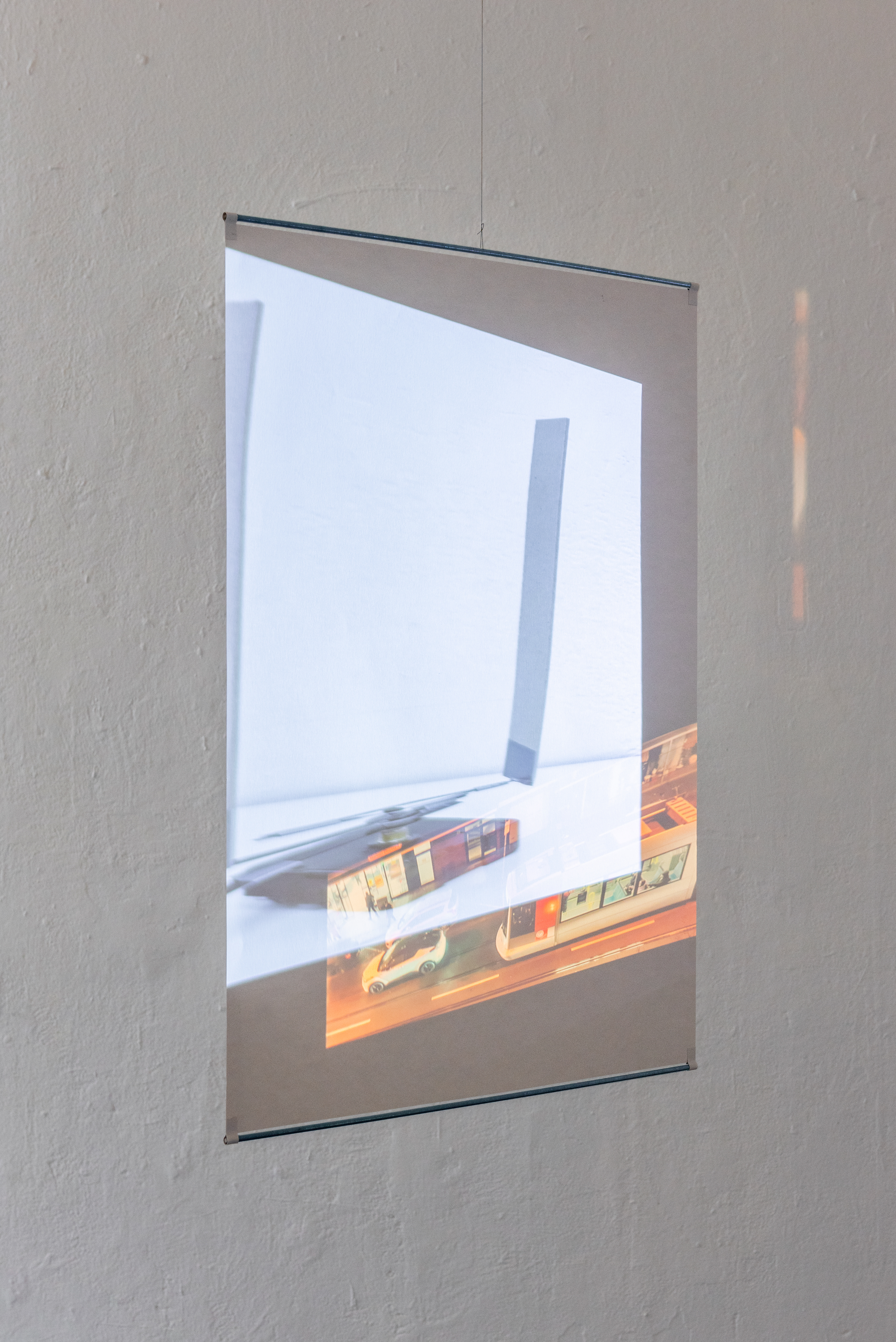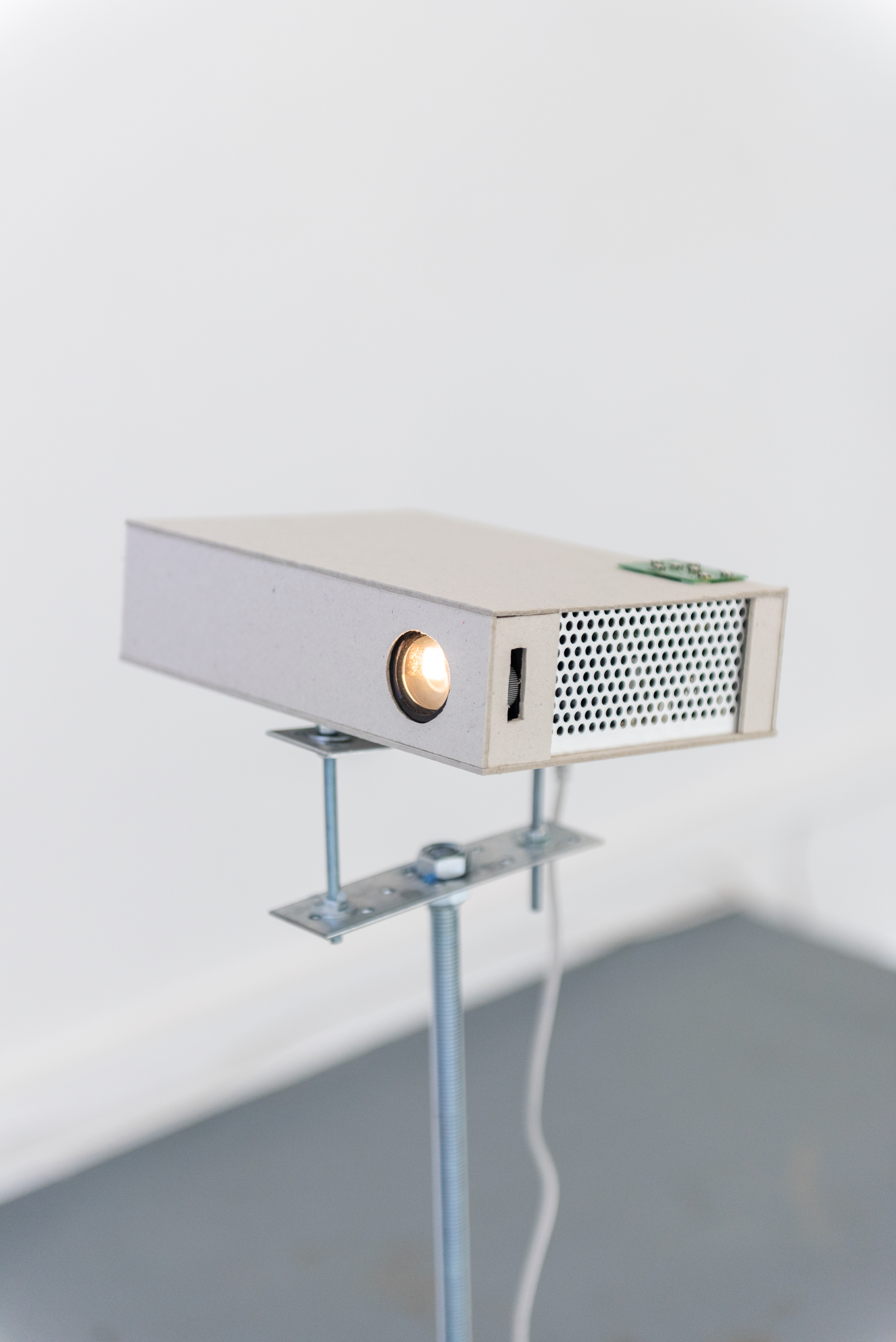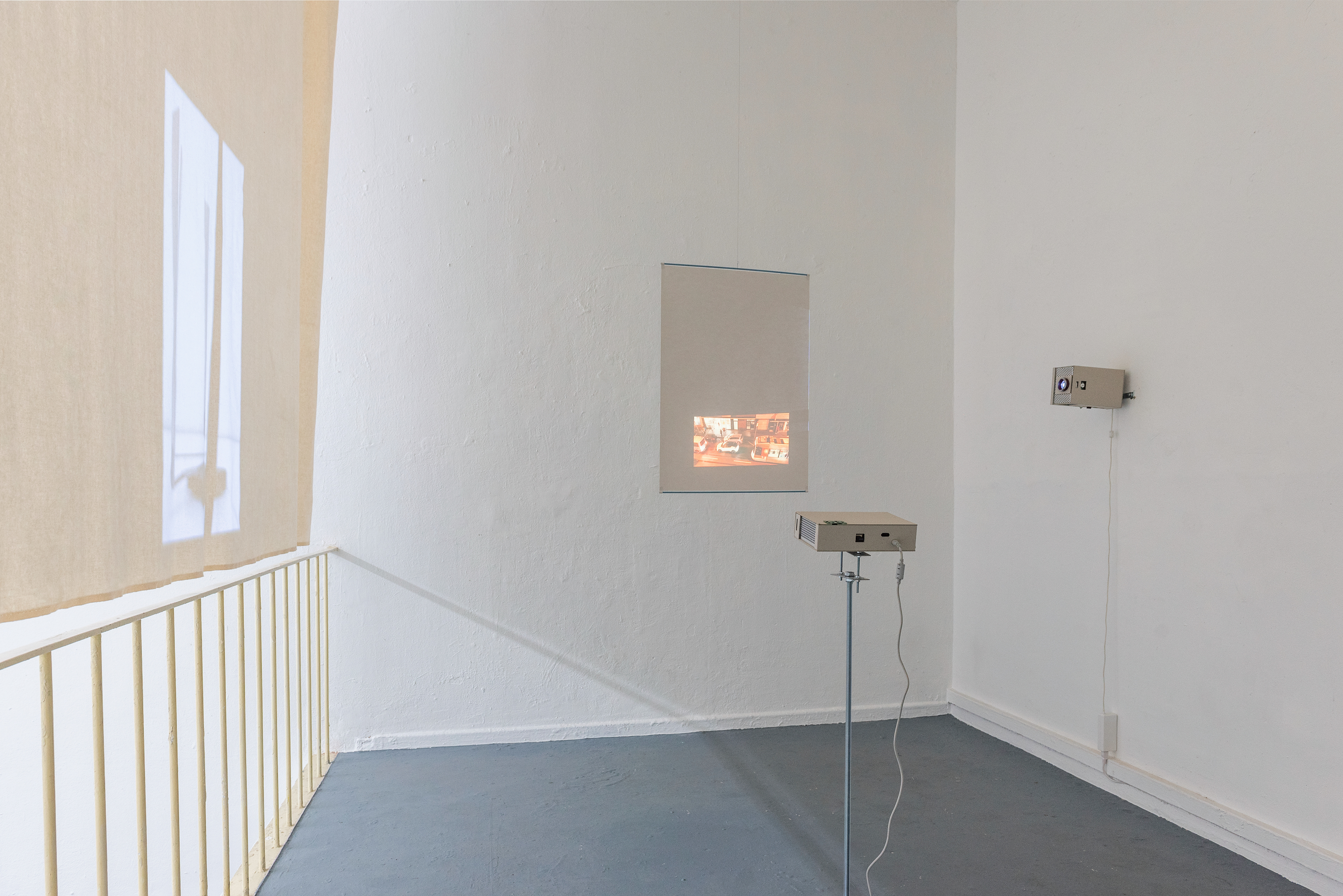 2 videos (clockwork: 30min/ tramway: 9:48min), projector parts, gray cardboard, aluminum, A3 paper (rotation through air circulation), thread, metal parts